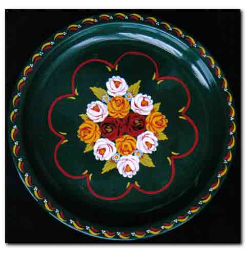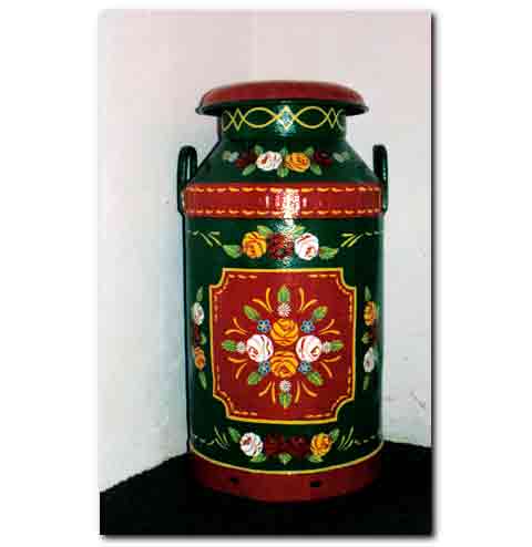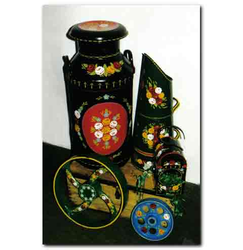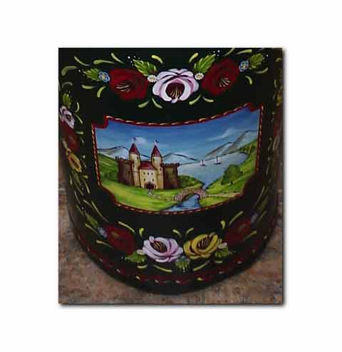 Narrow boat painting, or canal art is a traditional British folk art. This highly decorative folk art once adorned the working narrow boats of the inland waterways of Britain. Canal ware, barge ware, or gift ware, are used to describe decorated trinkets, and household items, rather than the decorated narrow boats. Canal ware is typified by strong vibrant contrasting colours, stylised roses and castle scene panels. Traditional barge ware items are highly decorated, with little blank space in the design. No-one really knows how this British folk art began. Its origins appear to be in the late 1700s when Britain's inland waterways were at their busiest - similar castle scenes and styles of painting can be found on cheap mass-produced items of the day.