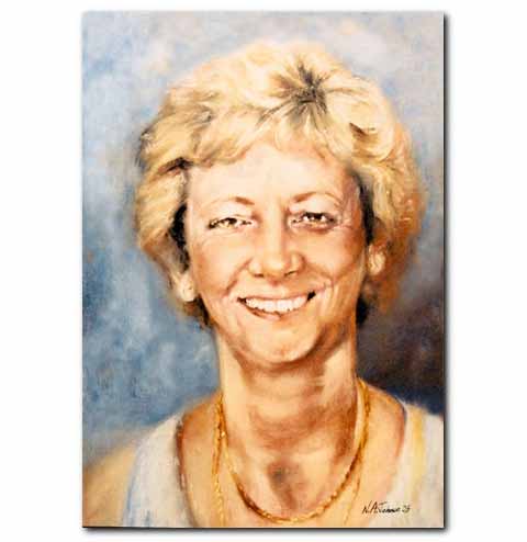 In the facial portrait examples on this page, notice the background is kept simple in all cases. This maintains the focus on the subject of the portrait. Portrait paintings of people require good quality photographs to work from. Providing the artist with a range of photo's for reference can help in conveying the personality of the subject, and help to give a clear idea of skin tone and eye colour etc. Multiple subjects can make for complex works, especially if referenced from separate photographs. They, therefore, can be more costly than a single facial portrait of the same size.